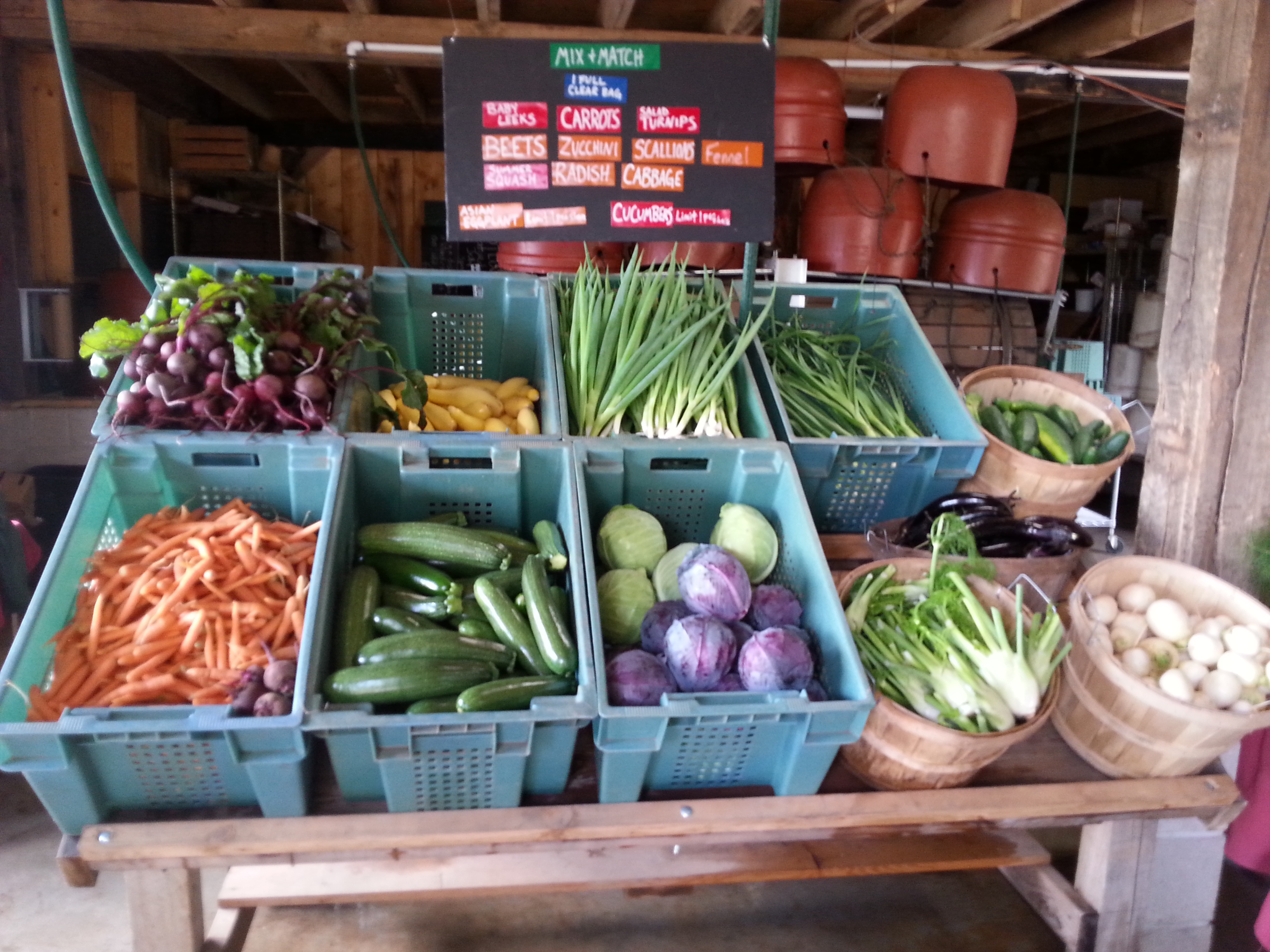 Certified Organic Farm with some Transitional Crops — You might know last year we decided to get certified organic, after many years of growing organically without certification. We like being counted and more visible as organic farmers, including the (somewhat hidden) red signs along the ditch. But we do have one field right now that is in transition to organic, meaning it was sprayed with an organic-prohibited material when in conventional crops less than 3 years ago. Our transitional field was last sprayed in 2012, so it will be eligible for organic certification in 2015. For now, while we use all the same organic growing practices there, anything that is harvested from that field should be labeled as transitional. So you will start seeing some transitional signs in the barn — right now on kale, later on broccoli, some cabbage, plus the fall greens, lettuce and spinach. Same practices, just grown on a field that we’re bringing out of the cycle of inputs and pesticides, and into healthy, life-building organic production. We are always happy to talk about more in detail, if you have any questions please always ask.