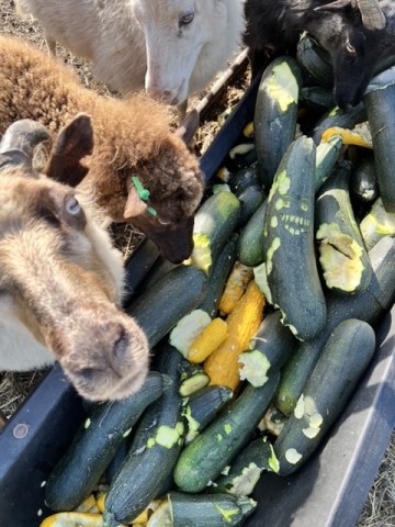 We planted a few too many summer squash and zucchini this summer, and it’s been a very productive summer for them. This is a year we could have underplanted and had enough! We’ve harvested the max we need for the share and that the Northfield Food Shelf could distribute. Food shelves and warehouses often get so many squash and cucumber donations in the summer, that they need to limit what they’ll accept, since everyone can only eat so much of one thing. So we let some go unharvested, and naturally they made baseball bats. Which, naturally, are good for carving. And which, naturally, the nearby flock of sheep was happy to devour. They’ll turn “the welcoming committee” into wool and meat for the Bentz’s customers in the area.
