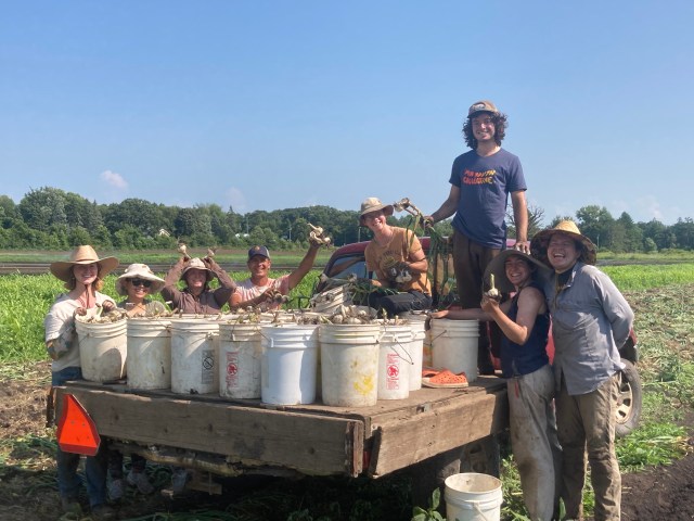 We harvested garlic last Monday. It was in the greenhouse for a few days, maybe you smelled it when you walked up the driveway. The bulbs are big and gorgeous and appear to be free of the mite that gave us a half harvest last year. It was a fun day — and it went faster than it has in a long time thanks to help from friends and family member of our crew, which doubled the size of our harvest crew for most of the day!