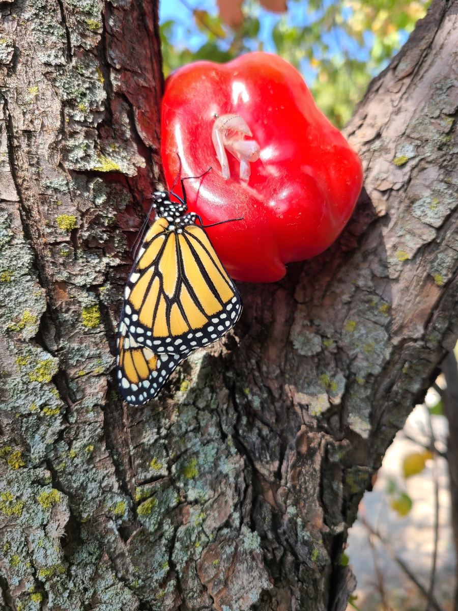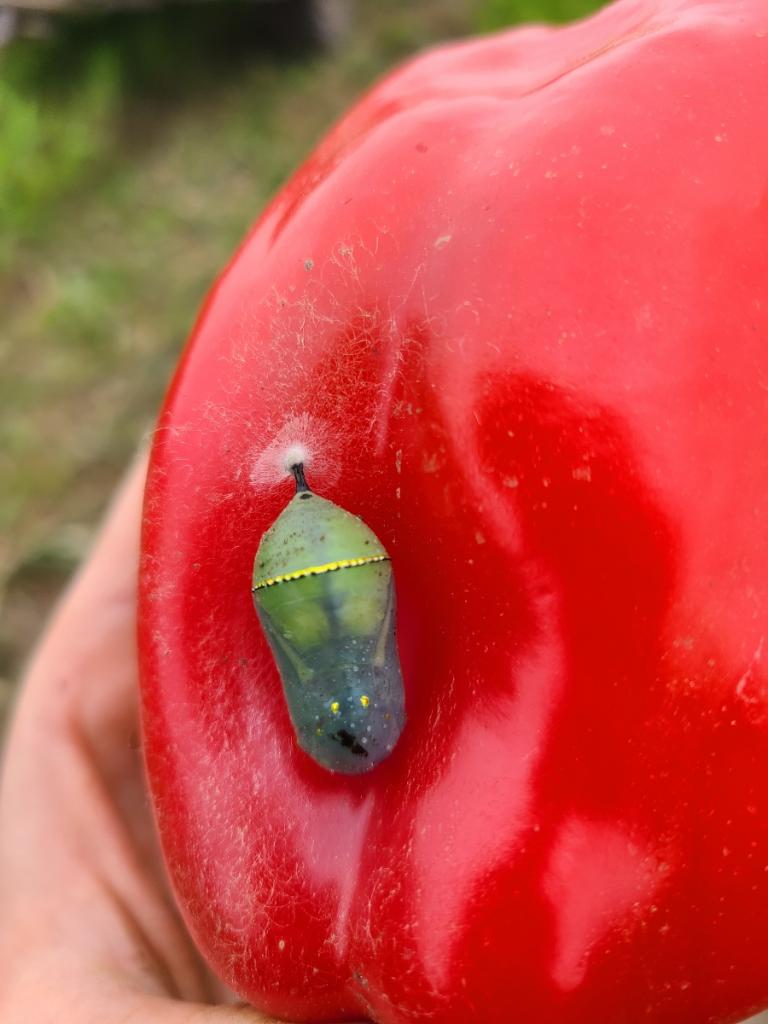 Erin found the chrysalis on that pepper while picking, and put it on the dash of the farm truck. At 12:30 Ben took it out, and placed it in the crotch of a tree near the barn. He noticed a bump protruding, like an elbow or kicking foot of a human baby in its mom, but just assumed it’d still be a few days. At 2:30 we came back to the barn with a load of somethings, and that butterfly was hanging there, wet and drying its wings but otherwise looking ready to fly!