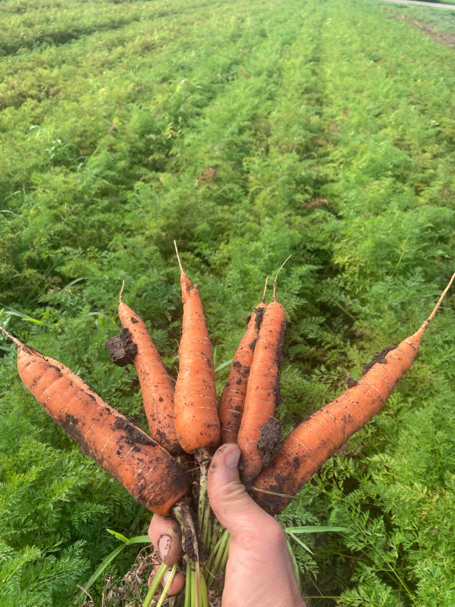 But to the carrots – carrots with aster yellows get stunted and a bitter flavor. Half our big carrot planting is right next to this year’s garlic, so we were worried about the leafhoppers moving into the carrots. We borrowed an insect net from a friend, and before we harvested, Erin swept through the garlic to see how many leafhoppers we might have. Fortunately there were barely any in the garlic! There were many more in a nearby cover crop, but still not enough to be a concern for the carrot crop. Phew!!