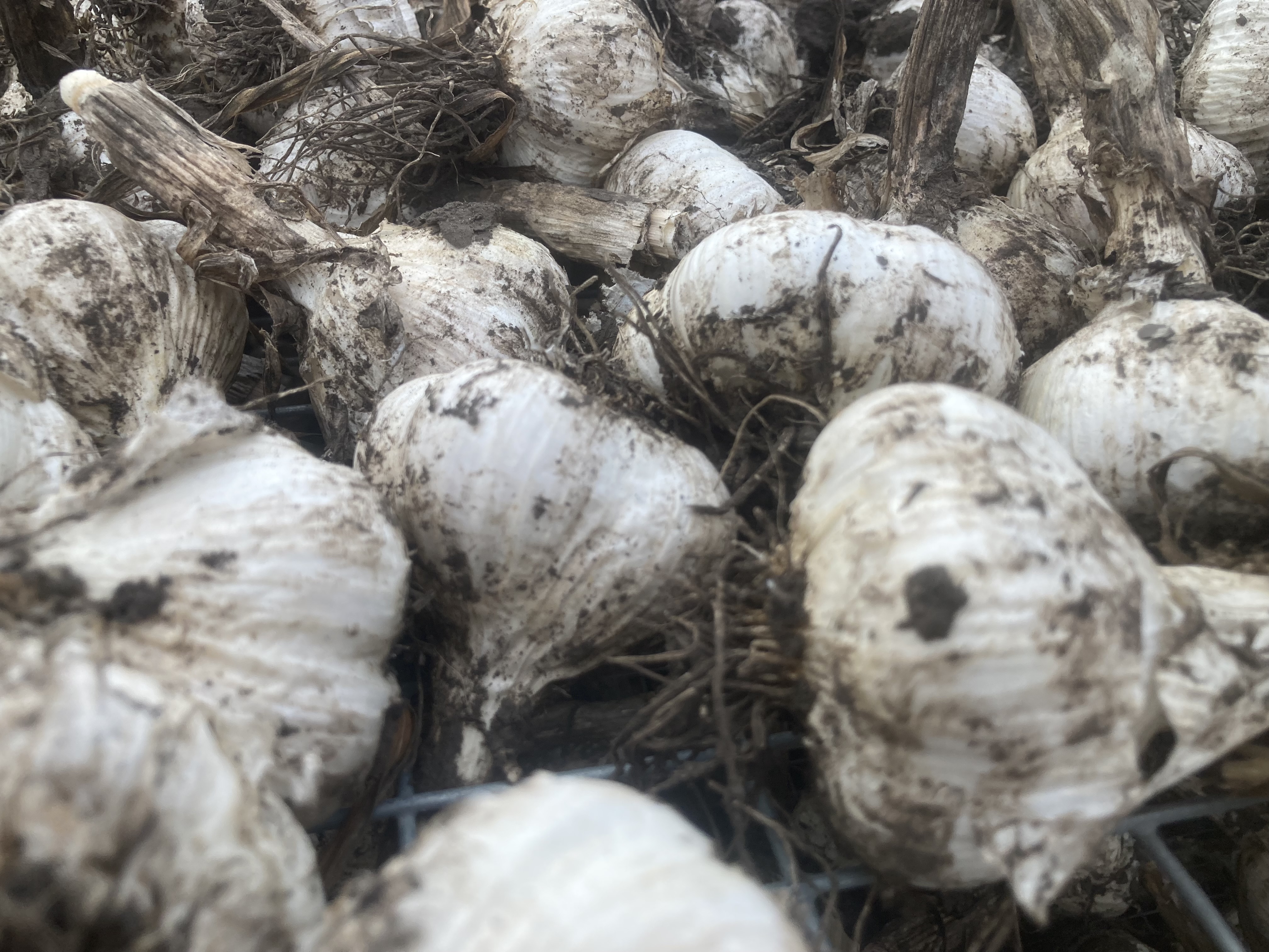 And Garlic starts this week!!! We do garlic in the share for 6 weeks, 1 head per full share each week. Split shares please communicate with your share partner who gets the garlic each week — split shares will each get a total of 3 garlic as part of the share. After 6 weeks it will be for sale in the barn, including for big orders and stocking up for the fall and/or winter. If you want more than a head per week during these 6 weeks you can also buy as many more as you want. $1.25 / head. Can be purchased on the spot, no need to pre-order garlic.